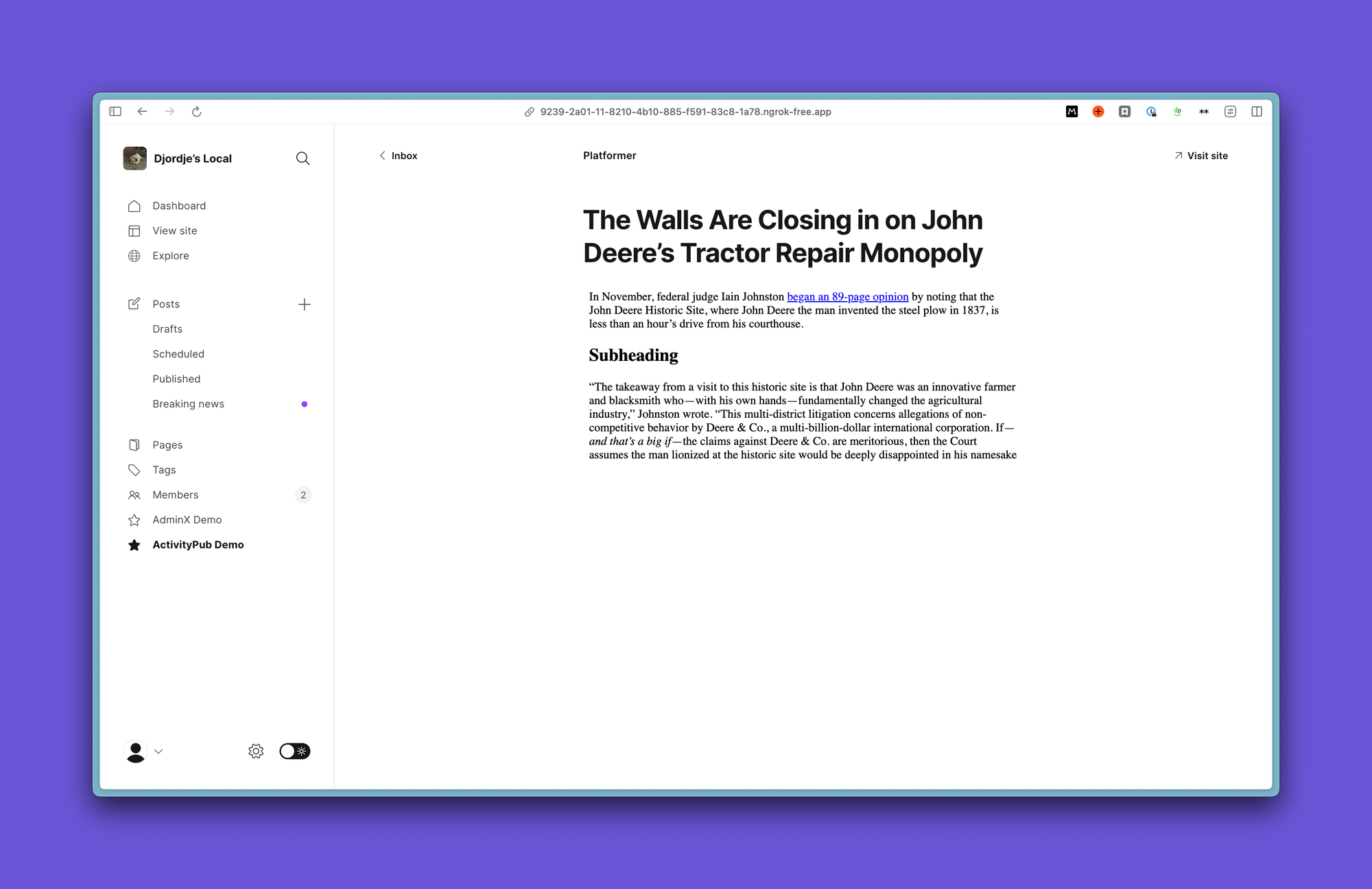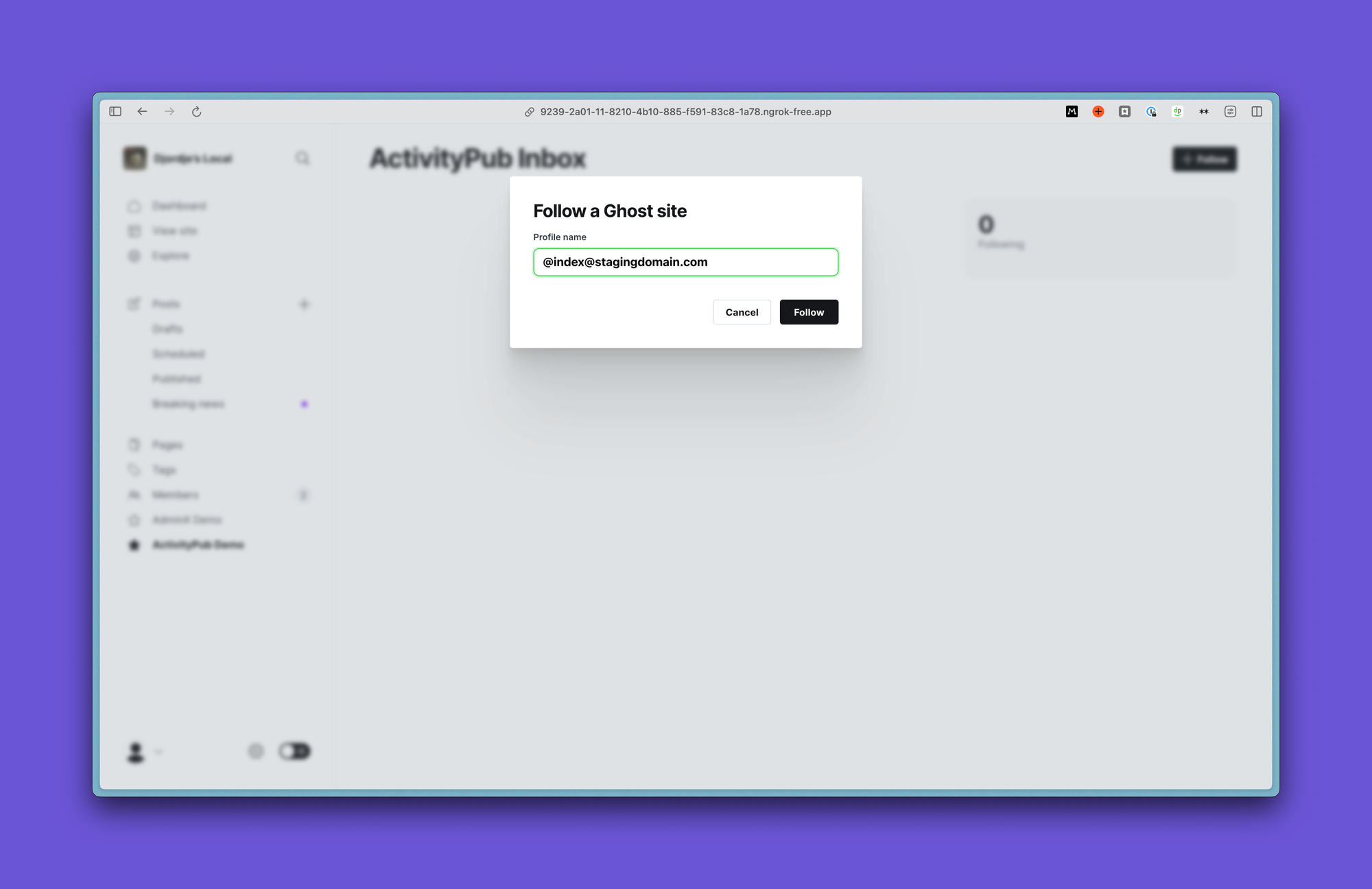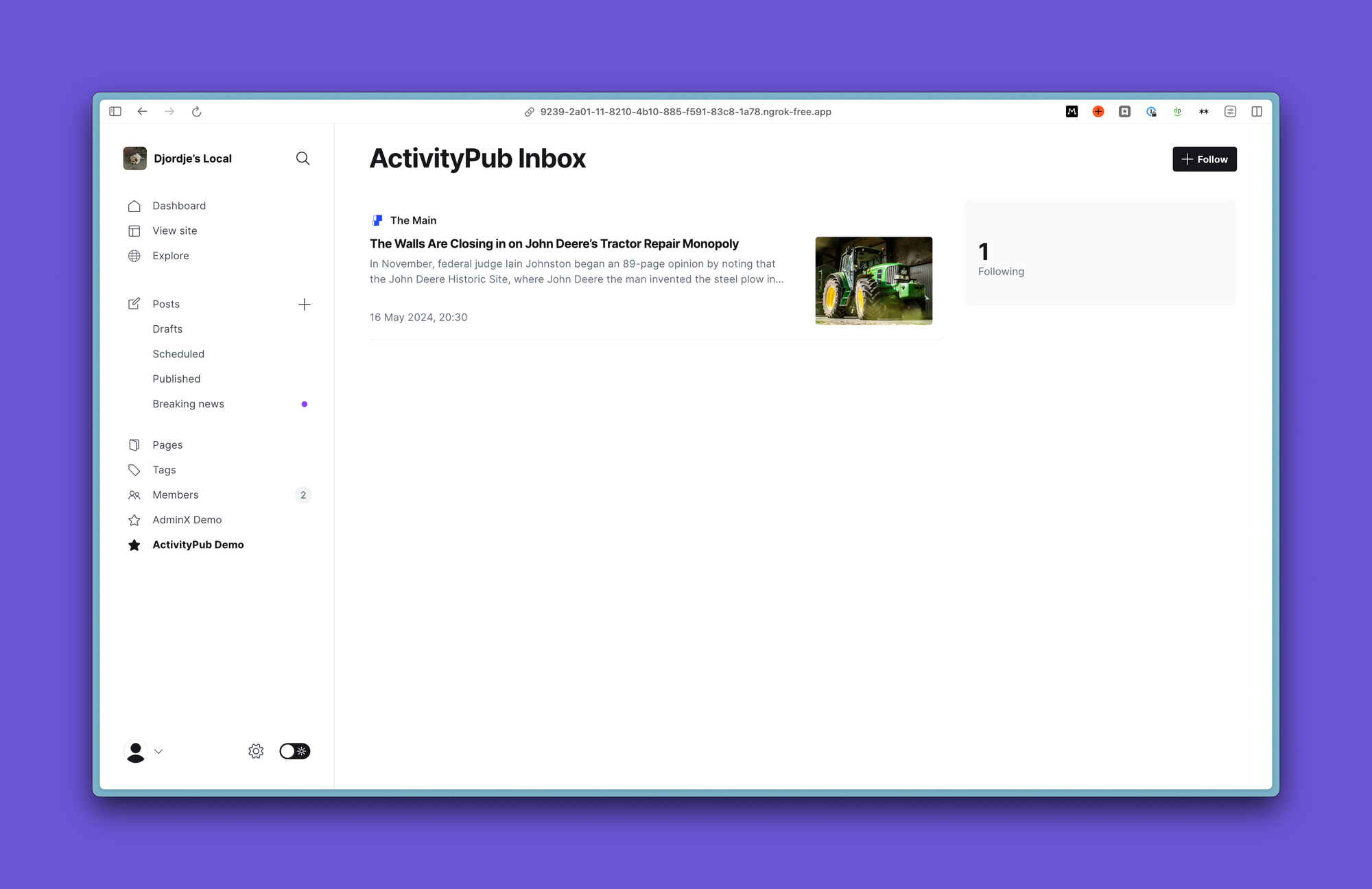 Having overcome initial hurdles of a basic inbox and outbox with bubblegum and sticky tape (shoving everything into memory), we set about working on our very first use-case. Can we get one Ghost publication to follow another Ghost publication?