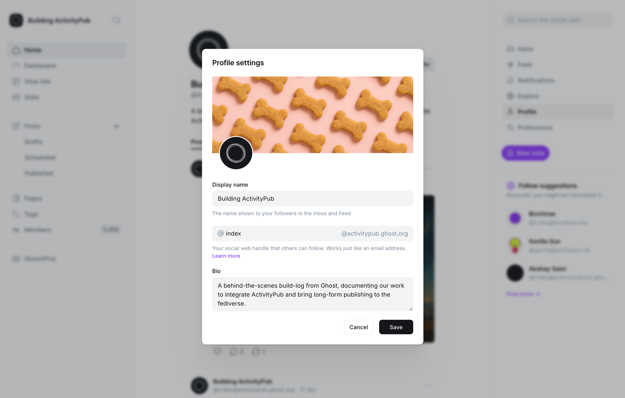 As well as being able to change your social web username, you can now also edit the rest of your social web profile. By default, we set up your profile with the title, description, and icon of your Ghost website. Now you can customize them for the social web, and add an optional cover image.