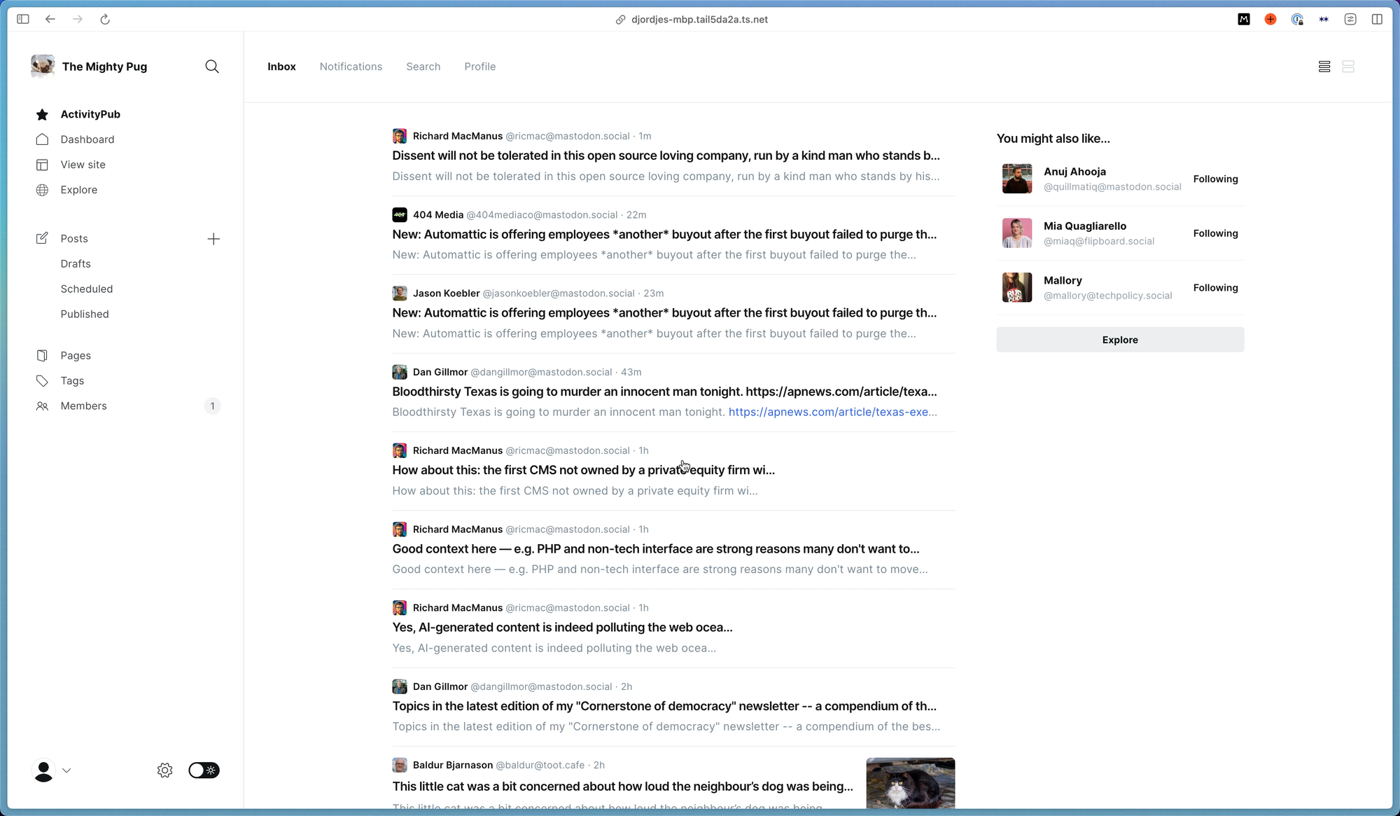 We also just started testing cross-compatibility with WordPress, which we're super excited about. A lot of the underlying concepts developed by Matthias in the official WP ActivityPub plugin are very similar to what we're working on.