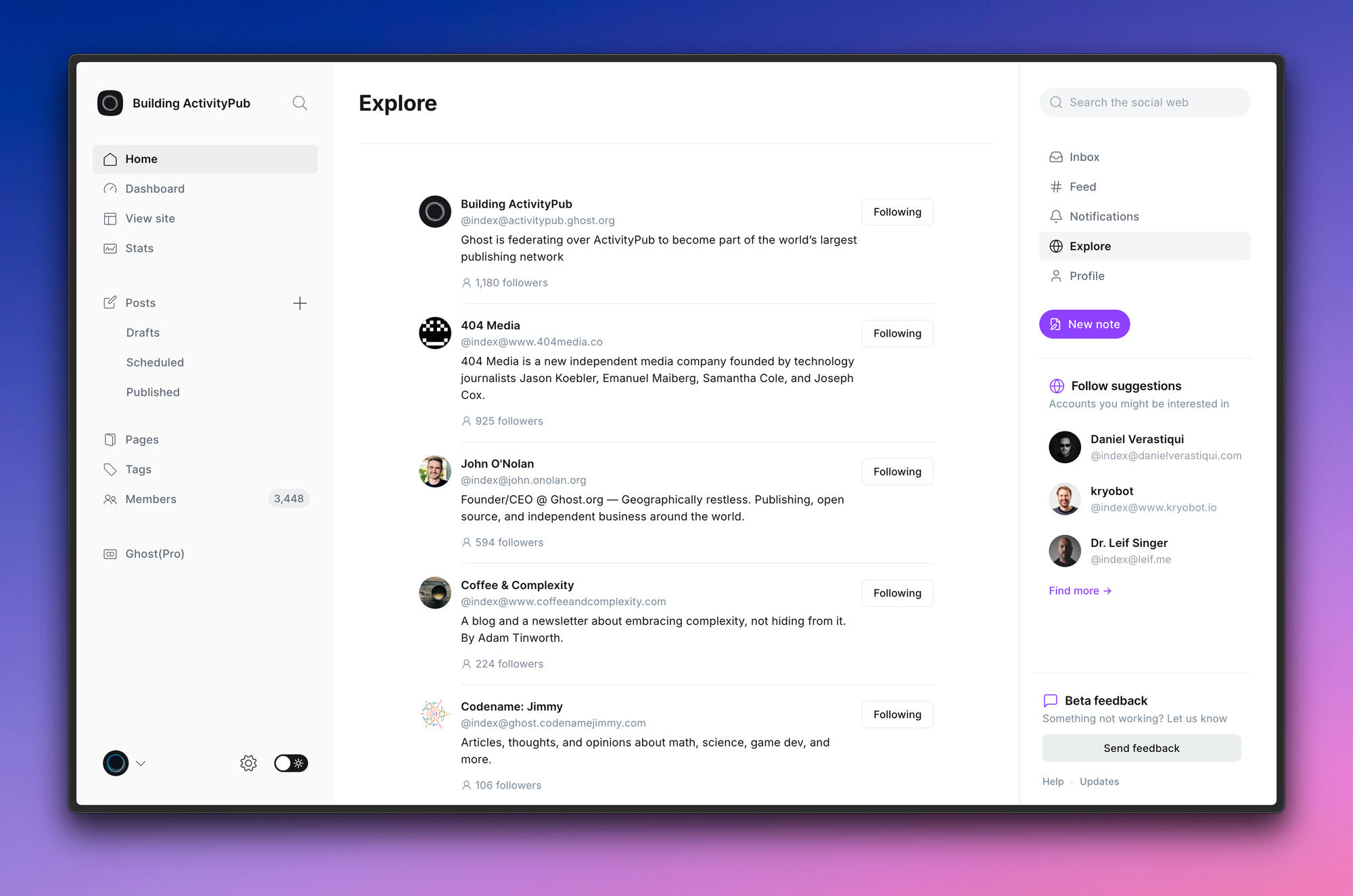 Speed and bugfixes, mainly. We closed another 44 issues in the past week as we resolved problems that we noticed, and you reported. We also announced the social web beta on the main Ghost changelog, causing a second wave of publishers to turn on Fediverse sharing for the first time.