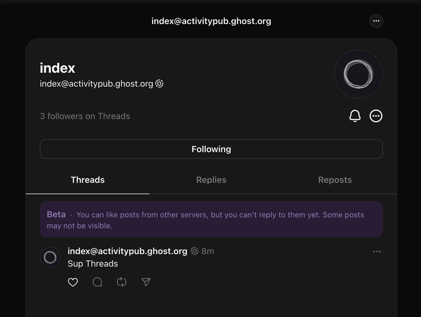 Note: You have to interact with Threads in some way to enable this connection. Once you follow, like, or reply to something on Threads from Ghost, then Threads will index the Ghost profile. They do this so that anyone who doesn't want to have their profile show up on Threads, doesn't have to.